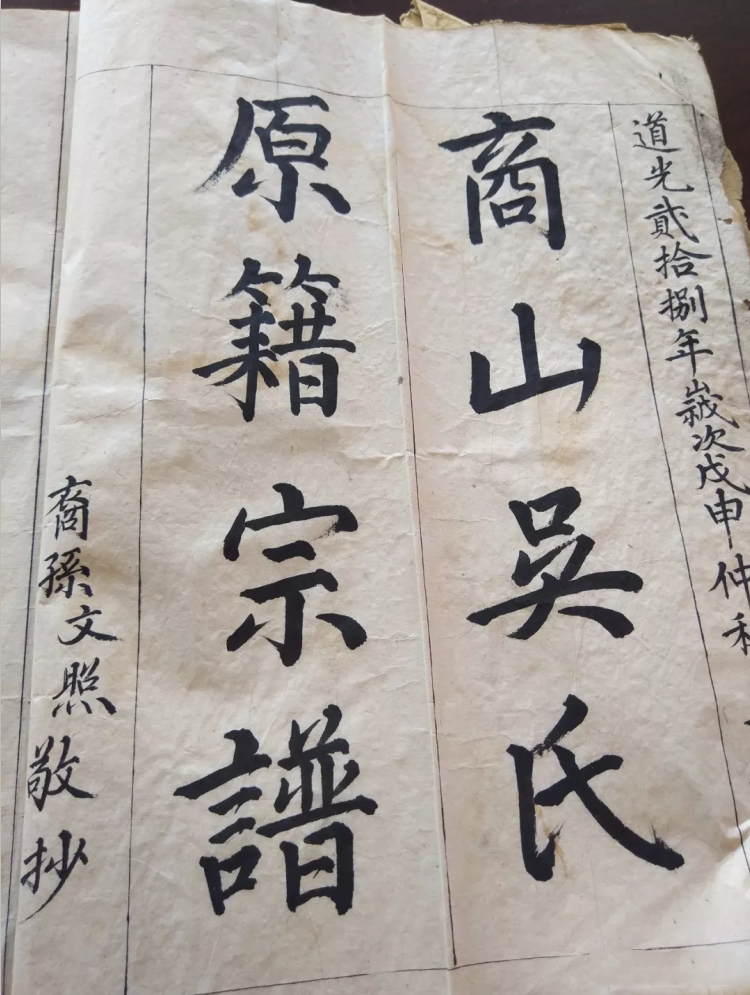 北,他们个个拉着我的双手,久久不肯放下。问我们先祖迁出的年代,问我们的支系繁衍……,还带我看了祖上700多年前所属的九房祠遗址。在村办公室,商山镇的干部及村党支部书记陈德平、村干部胡国刚、吴新喜等正在迎接我们的到来。宗亲吴祖兴把家里珍藏的《商山吴氏原籍宗谱》也拿到这里,让我观览、拍照。商山镇及双桥村的领导们还要求我介绍了天门吴氏的有关情况,并邀我题写了“根深蒂固”四个大字以作纪念。