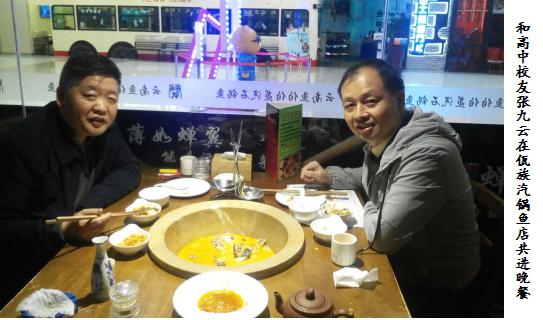 张九云是南县五中校友,现在无锡办汽车配件厂并担任总经理,事业红红火火。去年以来,先后两次到广州,邀请我有时间去无锡玩。我11月1日在南京时曾给他打电话,他嘱我到无锡后联系。我2日看完梅里古都吃完午饭后才给他打电话问工厂的具体方位。下午,在他的厂区及办公室参观,晚上两人一起去吃佤族汽锅鱼。我发现无锡的工业园生产一派繁忙,在国家经济发展速度明显放缓背景下,仍然呈现欣欣向荣之景象;而云南的阿佤人民如今将民族特色饮食店都开到如此遥远的地方,且极受无锡人民欢迎,座无虚席,又唱出了一曲市场经济的新歌。我对经济形势原有一些悲观的,看了无锡微观方面的表现,又感觉国民经济整体有理由继续偏乐观,这是无锡旅游除谒祖外的另一收获。