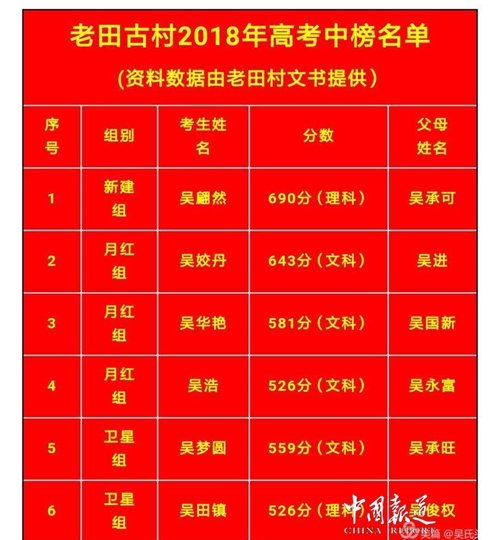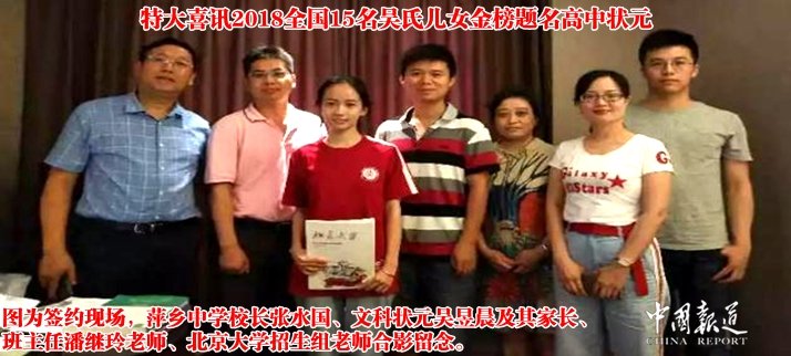 6月24日上午9:00,萍中学子萍乡市文科状元美女吴昱晨同学率先签约北京大学!昨日,福建安溪理科第一名吴偌菲告诉记者,很感谢华夏吴氏网和天下吴氏网的宣传报道,但是在还没有收到录取通知书之前感到压力很大。更令人惊喜的是,安徽九华山老田村有25名吴家学子同时高考上线,现将部分名单公布如下〔排名不分先后〕。 【吴氏头条】