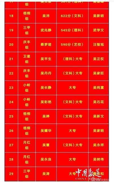 6月24日上午9:00,萍中学子萍乡市文科状元美女吴昱晨同学率先签约北京大学!昨日,福建安溪理科第一名吴偌菲告诉记者,很感谢华夏吴氏网和天下吴氏网的宣传报道,但是在还没有收到录取通知书之前感到压力很大。更令人惊喜的是,安徽九华山老田村有25名吴家学子同时高考上线,现将部分名单公布如下〔排名不分先后〕。 【吴氏头条】