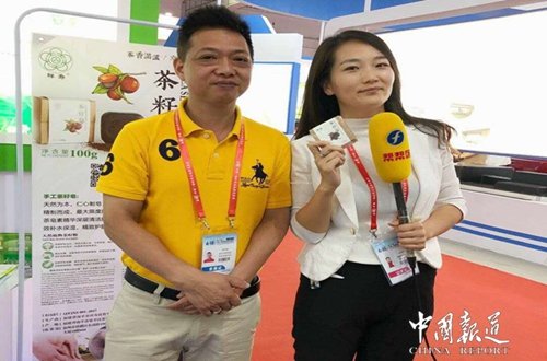 中国报道讯(吴蜀丰福建报道)6月18日,第十六届中国.海峡项目成果交易会在榕开幕,本届南平馆以“绿色创新。赶超发展”为主题,以“清新福建。生态南平。山水武夷”为主要创新。客商对南平馆天然茶籽系列产品产生浓厚兴趣。