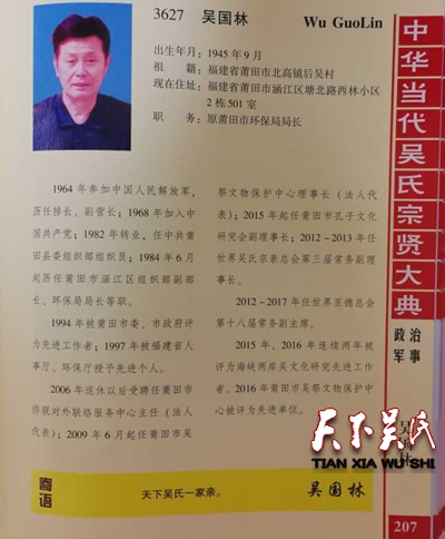 2015年、2016年连续两年被评为海峡两岸吴文化研究先进工作者。2016年莆田市吴祭文物保护中心被评为先进单位。天下吴氏一家亲。