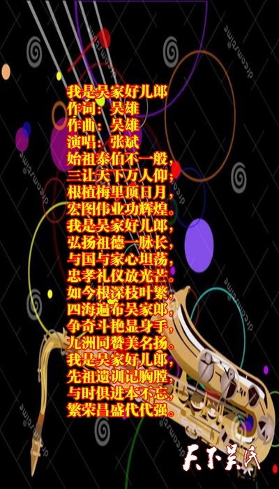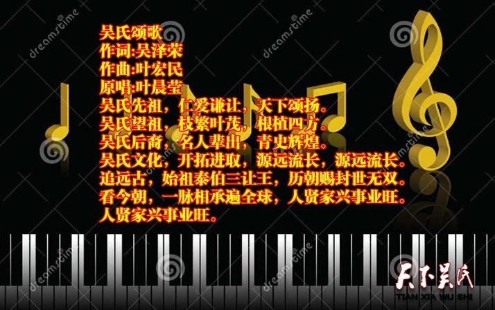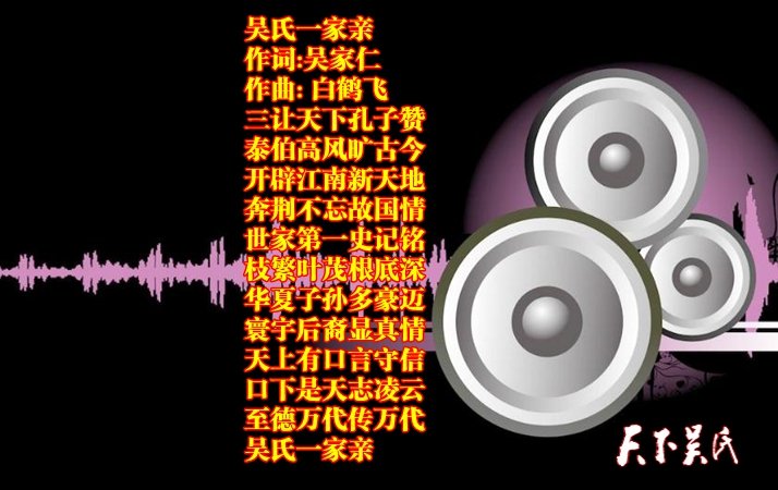 这些好歌分别是《中华吴氏》《吴氏一家亲》《吴氏颂歌》《吴氏子孙》《江南吴氏子孙》《泰伯颂》《我是吴家好儿郎》《吴氏天妃》。前四首音乐均已上传《天下吴氏网》公众号,关注即可欣赏下载,其余待续上传。