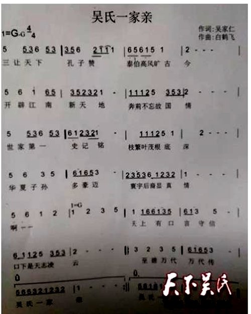 中国报道讯(吴蜀丰报道)数千万吴氏儿女都在传唱这九首吴氏之歌,每首歌都是一部历史,每行歌词都是一篇完美的故事,这些歌词让人铭记不忘,如“三让天下孔子赞,世家第一史记铭。”“让德继德弘德,德披两家天下。”“国功宗功族功,功开万古江南。”“至德留芳,世家第一。”“天上有口言守信,口下是天志凌云。”“吴氏先祖,仁爱谦让,天下颂扬。”“吴氏望祖,枝繁叶茂,根植四方。”“吴氏后裔,名人辈出,青史辉煌。”“与国与家心坦荡,忠孝礼仪放光芒。”