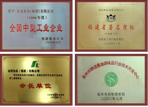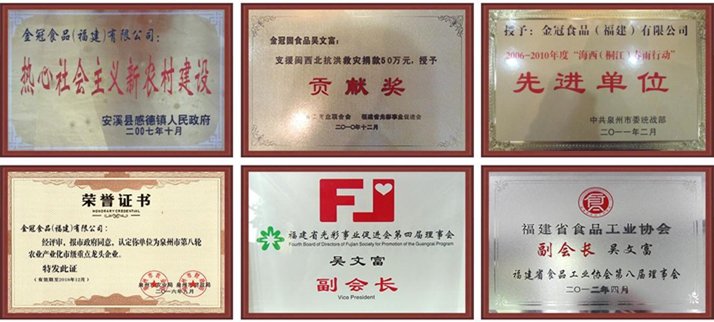 历年来,企业通过S09001国际质量管理系认证, HACCP食品安全管理体系认证,1S014001环境管理体系认证,CIQ出口卫生注册美国FDA认证和QS认证,严格品质管理,注重品牌建设,“金冠园牌先后荣获“中国驰名商标”、“中国星火计划项目”、“全国食品工业龙头食品企业”、“福建省星火行业技术新中心”、“食品卫生A级单位”,“质量稳定产品”、“质量第一,诚信经营企业”、“市先进单位”、“守合同、重信用企业”、“品牌泉州公众印象奖”等荣誉称号。产品畅销全国各地并大量出口,深受广大消费者青睐。