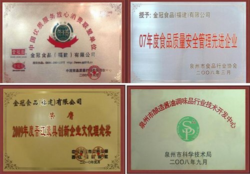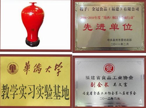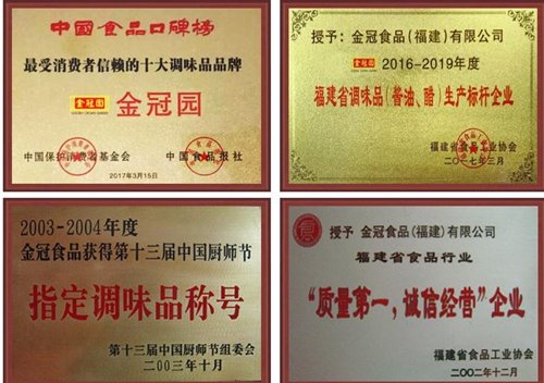 历年来,企业通过S09001国际质量管理系认证, HACCP食品安全管理体系认证,1S014001环境管理体系认证,CIQ出口卫生注册美国FDA认证和QS认证,严格品质管理,注重品牌建设,“金冠园牌先后荣获“中国驰名商标”、“中国星火计划项目”、“全国食品工业龙头食品企业”、“福建省星火行业技术新中心”、“食品卫生A级单位”,“质量稳定产品”、“质量第一,诚信经营企业”、“市先进单位”、“守合同、重信用企业”、“品牌泉州公众印象奖”等荣誉称号。产品畅销全国各地并大量出口,深受广大消费者青睐。