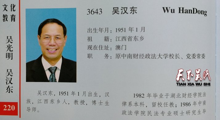 吴汉东,1951年1月出生,汉族,江西东乡人,教授,博士生导师。