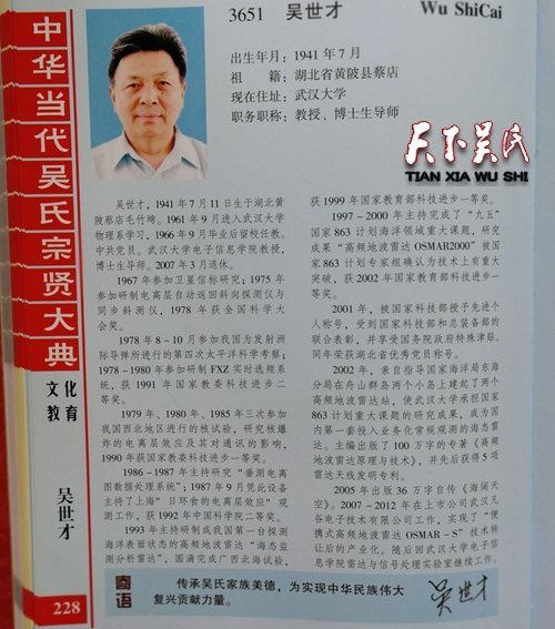 吴世才Wu ShiCai,出生年月:1941年7月,祖籍:湖北省黄陂县蔡店,现在住址:武汉大学,职务职称:教授、博士生导师。吴世才,1941年7月11日生于湖北黄陂蔡店毛竹塆。1961年9月进入武汉大学物理系学习,1966年9月毕业后留校任教。中共党员。武汉大学电子信息学院教授,博士生导师。2007年3月退休。