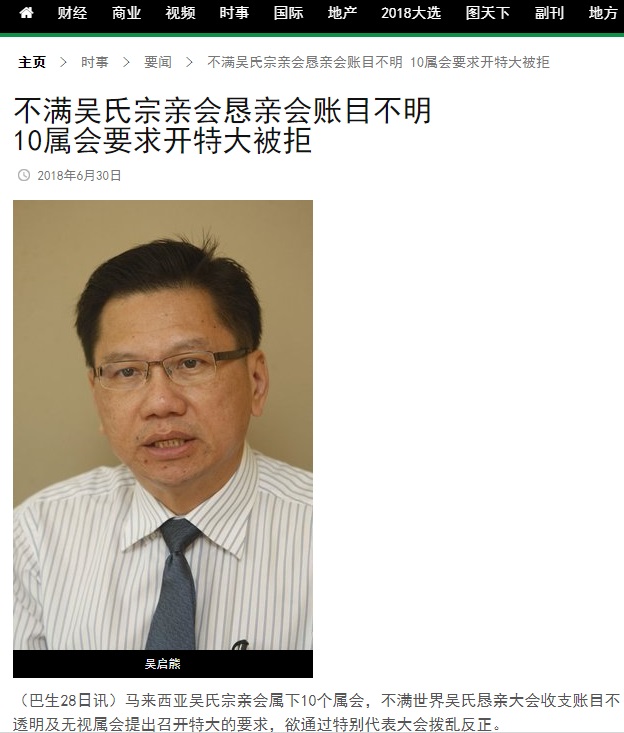 马来西亚吴氏宗亲总会总财政吴庆华在记者会上,指称世界吴氏垦亲大会的账目不透明