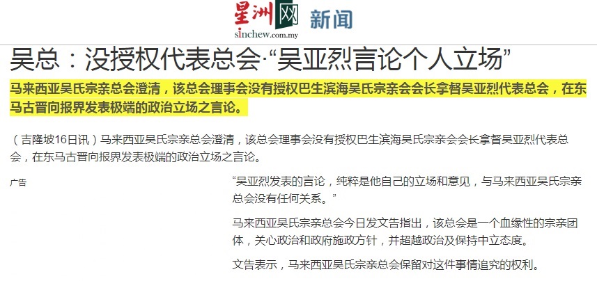马来西亚吴氏宗亲总会澄清,该总会理事会没有授权巴生滨海吴氏宗亲会会长拿督吴亚烈代表总会,在东马古晋向报界发表极端的政治立场之言论。