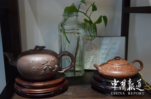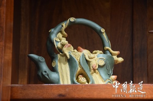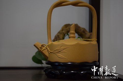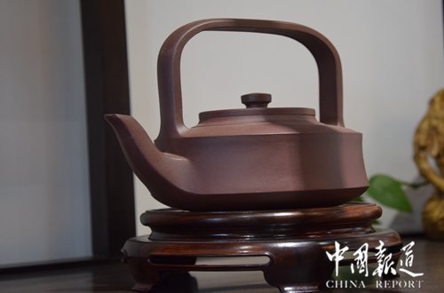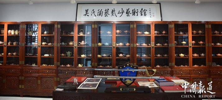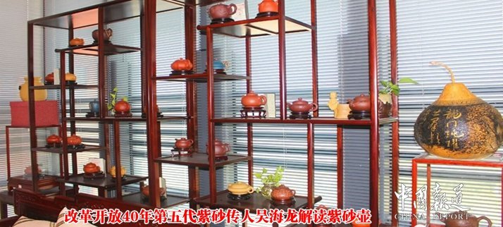 中国报道讯(吴蜀丰 江苏报道)日前,在江苏省常熟市东方红木家俱艺术馆出席 “千秋文脉传盛世”改革开放40周年中国苏作红木文化展新闻发布会的媒体,对陈列于东方红木家具艺术馆的各种紫砂壶产生了浓厚的兴趣。壶的主人国家一级工艺美术大师吴海龙趁此机会,向到会媒体朋友“科普”紫砂壶知识。
