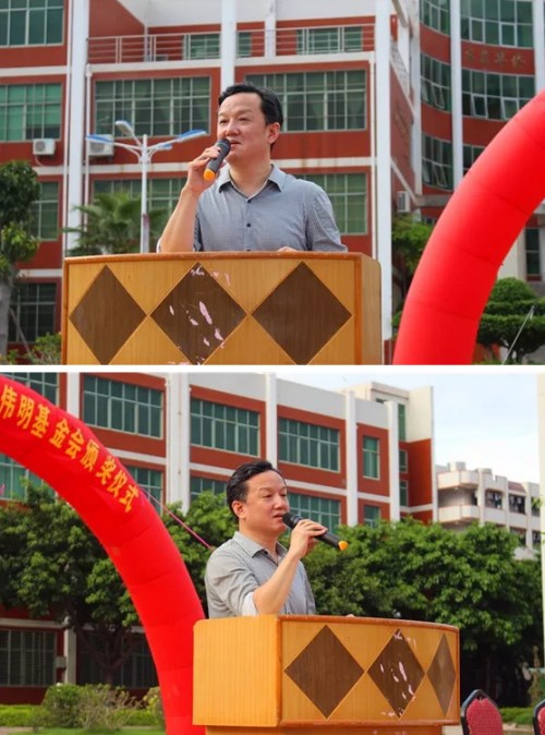 磁灶镇党委陈礼新副书记上台致辞,他希望获得奖学金助学的同学们,不忘基金会及所有关爱你的人,要戒骄戒躁、再接再厉,用实际行动来不断鞭笞自己、完善自己;希望磁灶中学的教育水平再上一个台阶;并祝辛勤耕耘在教育教学第一线的广大教职员工教师节节日快乐!祝吴明生先生及其家族事业兴旺发达、蒸蒸日上!祝磁灶中学再创新的辉煌!