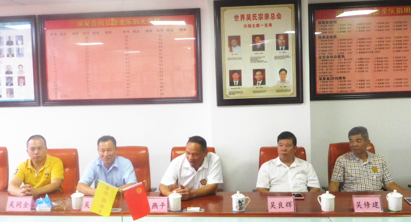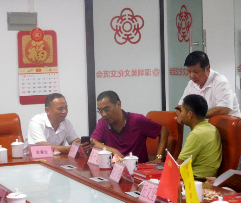 2018年9月17日下午,深圳增城商会的丘文坚先生、陈少锋先生、郭伟昌先生、宋育林先生、朱干聪先生、刘炳伦先生、梁永杰先生、何卫雄先生、陈沸丹女士、何思琪女士等嘉宾,受邀来到深圳龙华民治海韵大厦第十六楼的深吴会会所,深吴会吴燕平宗长、吴良辉宗长、吴松康宗长、吴修建宗长、吴同金宗长、吴钦泉宗长、吴裕军宗长、吴强宗长、吴春生宗长等热情地接待了贵宾,并请贵宾们参观深圳吴文化交流会,指导工作。
