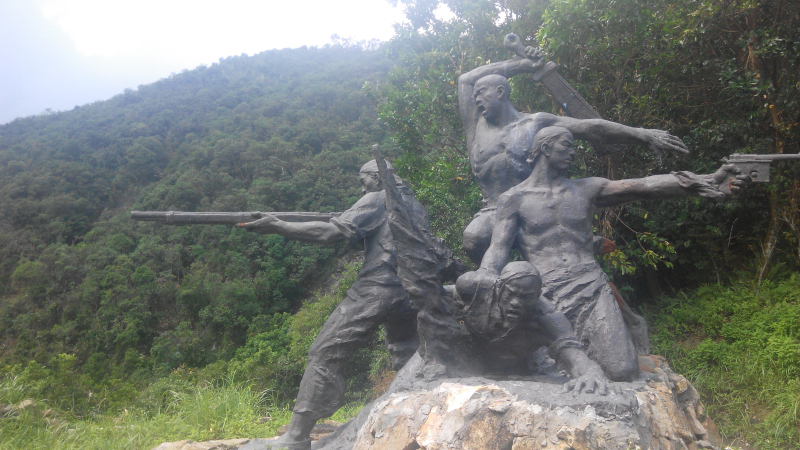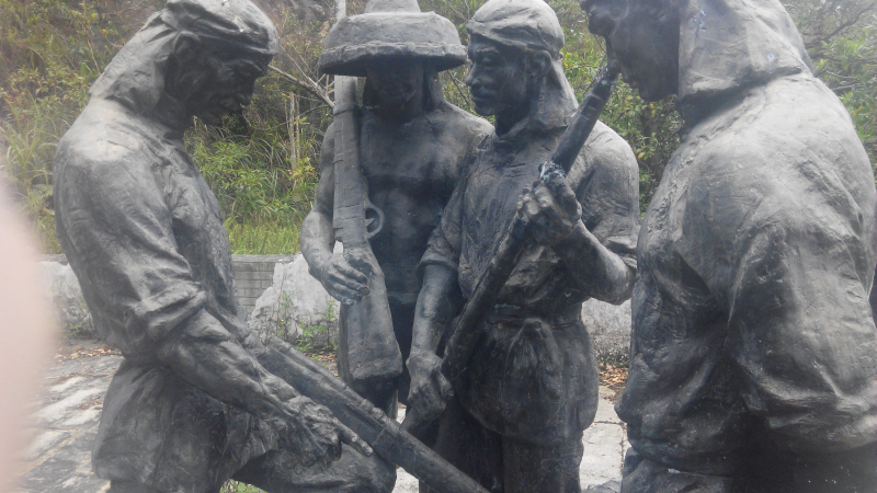 从“第一枪”这里往上还有路,不过我觉得这上面应该没有雕塑了,因为这第一枪,应该是在雕塑园的最高处才是,所以就继续向前走,看到的是“练兵试枪”的群雕,不过我注意到这个雕塑里,起义军士兵头上没留辫子,不知道是不是在清朝的时候,客家人不留辫子,还是参加起义后,起义军就剪了辫子。再往前走是运送枪支弹药等军火的雕塑。三洲田这里离海边(也就是现在深圳的大小梅沙)只有十里,很近,所以孙中山选择在这里起义,从海路运军火进来很方便。