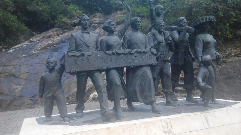 进入雕塑园,迎面是六个人的塑像,有介绍是孙中山等六人,其中一个是日本人,另几个是帮会首领或民间团体首领,塑像的主题是“激浪滔天”。由于塑像的左后方不远处也有一座群雕,所以来游玩的人,都冲这座群雕来了,这个群雕的主题是“同志仍须努力”,然后沿这个群雕往山上走,山路上也有山体滑坡的警示牌挡住。但是这个时间,天气晴朗,一般滑坡都是雨水催生的,所以大家也没在意,直接就上山了。连续看了几个群雕。