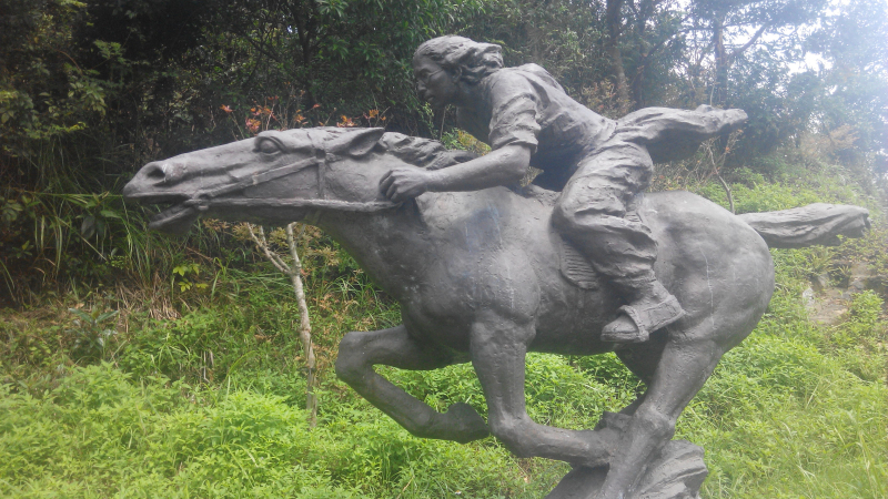 从“激浪滔天”的群雕右边的路上去后,到了“海外急电”这个雕塑这里,这是一个日本人向起义军飞马报信的雕塑,历史事件是,由于日本的台湾政府扣押了孙中山的军火,孙中山得知后,立即派这个日本人通知起义部队,立即撤退并解散。在这里,又见一个警示条住上山的路,说前方滑坡。别的人到这里就回去了,我看这里的滑坡只有几米长的距离,几米之后又是正常的上山台阶,所以我就走过这个滑坡地带,上了台阶。下一个群雕就是“第一枪”表现的是祭旗起义的内容。还有表现沙湾大捷的内容。从三洲田到沙湾,有二十多里的路程,起义部队从这里出发,得走两个多小时才可以到达沙湾。