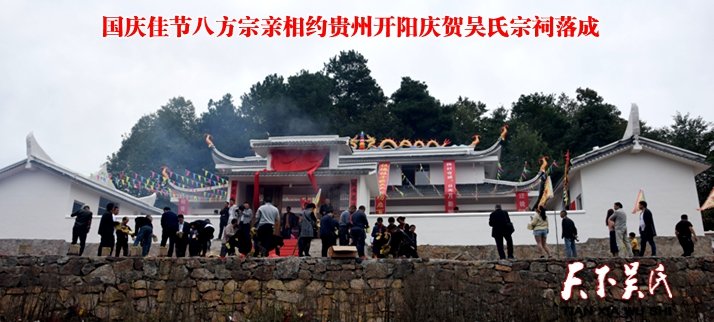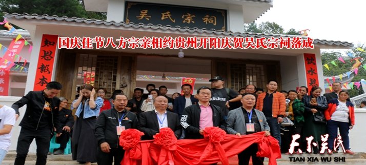 天下吴氏讯(吴蜀丰 贵州开阳报道 特约采编 吴天友 吴忠言 吴忠致 吴三祥 吴开早)【编者按】金秋十月,时逢国庆佳节,全国各地吴氏宗亲为庆祝伟大的祖国69周年,以不同形式开展各种庆祝活动,他们分别是白河县茅坪镇吴氏宗祠修缮一新迎来众亲庆贺菜洲古亩村吴氏举办首届外嫁女回娘家联谊活动贵州开阳庆贺吴氏宗祠落成,广东珠三角吴氏宗亲总会、广东信宜平花吴氏宗亲联谊会活动,湖北省吴氏宗亲联谊会文化节活动,即将于10月5日在江西萍乡举办中华吴氏宗亲总会第11届恳亲会海峽兩岸经贸论坛暨萍乡吴文化研究泰伯商会成立,即将于10月15日在甘肃省举办世界至德總會2018年會員代表大會暨第二屆海峽兩岸中華傳統文化高峰論壇以及10月20日在菲律宾举办的菲律宾让德吴氏宗亲总会110周年庆典活动等等。有道是∶吴氏文化正能量,至德精神在弘扬。开拓进取创辉煌,谱写时代新篇章。三让高风孔圣赞,第一世家史记传。天上有口遍天下,家风传承树典范。我是吴氏好儿郎,仁爱谦让传万代。