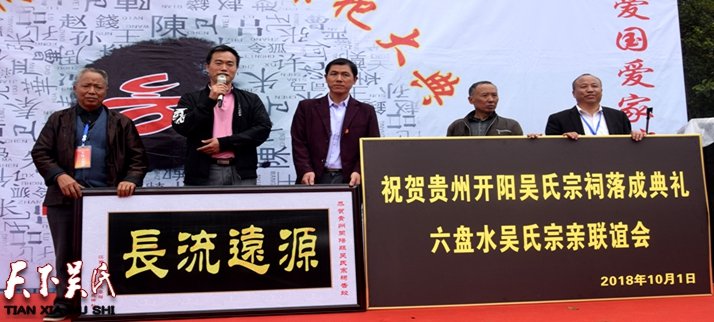 开阳吴氏宗亲名义会长吴文杰致欢迎词并讲话,向各地莅临的宗亲代表到来表示热烈欢迎!向长期关心支持开阳宗亲文化事业的各界人士表示衷心的感谢!大会由宗亲吴道斌和许莉女士主持。各地的宗亲代表纷纷上台作了精彩绝伦的演讲,分享了吴氏文化的内涵和重要性,十九大报告中说:文化是一个国家,一个民族的灵魂,文化兴则国运兴;文化强 民族强,没有高度的文化发展,就没有中华民族的伟大复兴。