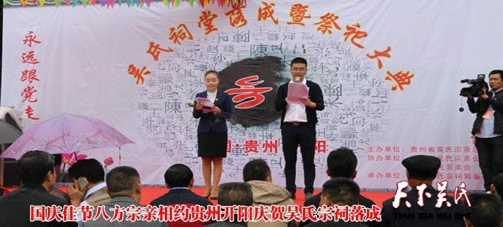 天下吴氏讯(吴蜀丰 贵州开阳报道 特约采编 吴天友 吴忠言 吴忠致 吴三祥 吴开早)【编者按】金秋十月,时逢国庆佳节,全国各地吴氏宗亲为庆祝伟大的祖国69周年,以不同形式开展各种庆祝活动,他们分别是白河县茅坪镇吴氏宗祠修缮一新迎来众亲庆贺菜洲古亩村吴氏举办首届外嫁女回娘家联谊活动贵州开阳庆贺吴氏宗祠落成,广东珠三角吴氏宗亲总会、广东信宜平花吴氏宗亲联谊会活动,湖北省吴氏宗亲联谊会文化节活动,即将于10月5日在江西萍乡举办中华吴氏宗亲总会第11届恳亲会海峽兩岸经贸论坛暨萍乡吴文化研究泰伯商会成立,即将于10月15日在甘肃省举办世界至德總會2018年會員代表大會暨第二屆海峽兩岸中華傳統文化高峰論壇以及10月20日在菲律宾举办的菲律宾让德吴氏宗亲总会110周年庆典活动等等。有道是∶吴氏文化正能量,至德精神在弘扬。开拓进取创辉煌,谱写时代新篇章。三让高风孔圣赞,第一世家史记传。天上有口遍天下,家风传承树典范。我是吴氏好儿郎,仁爱谦让传万代。