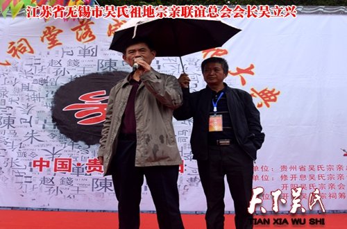 东南亚至德筹备会、贵州吴氏宗亲总会会长吴学强,开阳吴氏分会,六盘水市吴氏分会,毕节吴氏分会、都匀吴氏分会江苏无锡吴氏祖地鸿山镇及冯三镇政府及当地村委有关负责人先后上台先言并对吴氏宗祠的落成峻工表示热烈祝贺!云南吴氏组织代表团参加,以会长吴俊为团长,常务副会长、秘书长、副会长、常务理事为代表的代表团有,吴有龙、吴建根、吴三祥、吴瑛、吴士泽、吴加添、吴开早、吴金胜等代表。