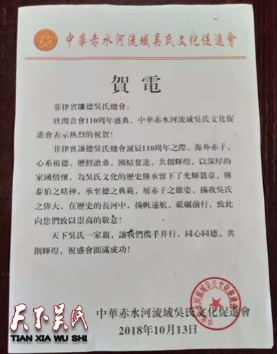 辽宁吴氏企业经济文促会致菲律宾吴氏总会贺电