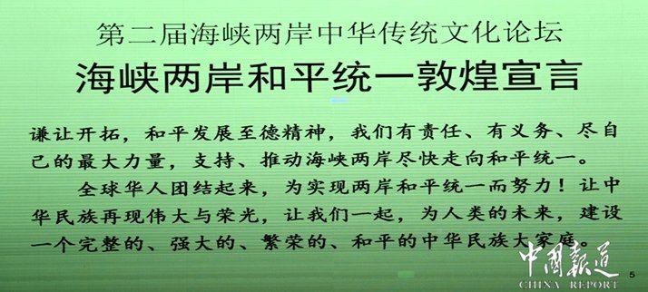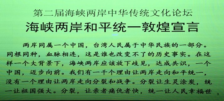 因此,我们来自世界一百五十多个国家和地区的华人华侨代表,在敦煌第二届海峡两岸传统文化论坛上郑重发出海峡两岸和平统一敦煌宣言: