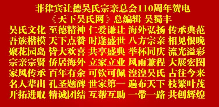 天下吴氏网致菲律宾让德吴氏总会110周年贺电