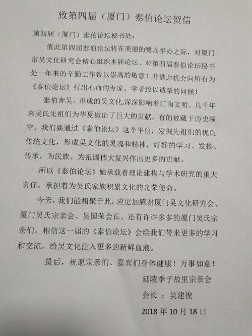 欣闻福建省厦门市吴文化研究会于2018年10月19至20日在厦门宾馆隆重举办第四届“泰伯论坛”!本次论坛会议是吴氏家族一次文化盛宴,对传承中国优秀的传统文化和发扬始祖泰伯三让至德精神有着重要的意义!本会受邀参加,深感荣兴!对本次论坛的举办表示热烈祝贺和美好的祝福!预祝厦吴贵会圆满成功举办本次论坛并取得丰硕的文化成果!顺祝全体参会嘉宾宗亲宗长身体健康!万事如意!