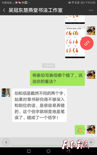 “大海书画院”副院长、“香港宅妆设计师事务所”和“素文化装饰设计工程公司”特聘的书法顾问、衡阳著名书法家吴冠东:“伯和佰是截然不同的两个字,如果对草书研究得不够深入和到位的话,是很容易弄错的,这个伯字就明显地是笔误了、错成了一个佰字!”
