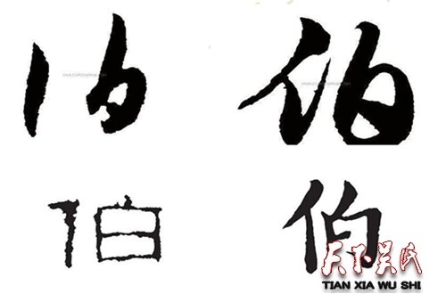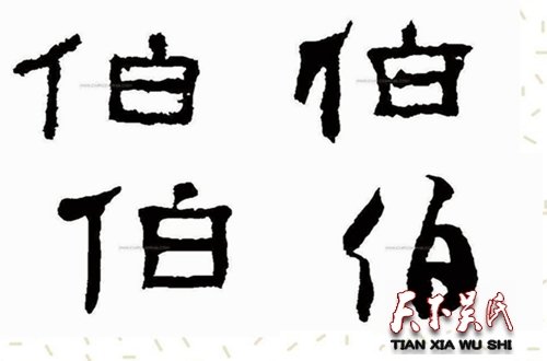 【关于伯字】有必要在此普及给读者诸位,伯是形声字亻为形,白为声。伯字属于白字族。在白字族里,白字都是声符兼义符。白字族汉字都与“空无一物”之义有关。伯的本义是“没有兄长的男子”、“老大”。现在一般称呼比父亲年长一些的男子。伯长,兄弟排行第一。 明董其昌《节寰袁公行状》:“要以风义交情,皎如白日,知公(袁可立)者宜莫如昌。是固,伯子司农枢千里征状意也,何忍辞!”伯,长也。——《说文》问我诸姑,遂及伯姊。——《诗·邶风 ·泉水》侯主侯伯,侯亚侯旅。——《诗·周颂·载芟》曰伯某甫仲叔季,唯其所当。——《仪礼·士冠礼》五官之长曰伯。——《礼记·曲礼下》千里之外访方伯。——《礼记·王制》忆作儿童随伯氏,南来今只一身存。——韩愈《过始兴江口感怀》又如:伯氏(长兄,哥哥);伯兄(长兄);伯氏(长兄);伯歌季舞(比喻兄弟情感和好融洽);伯姊(大姐) ,伯父。父亲的哥哥汝伯何由发如漆。——杜甫《醉歌行》又如:伯舅(对母亲的哥哥的称呼;古时帝王对异姓诸侯的称呼);伯叔(伯父叔父);伯娘(伯父的妻子);伯翁(父亲的伯父;丈夫的伯父);伯姑(大姑母)对年龄较长的男子的尊称将伯助予。——《诗·小雅·正月》女子对丈夫的尊称自伯之东,首如飞蓬。——《诗·卫风 ·伯兮》古代统领一方的长官分天下以为左右,曰二伯。——《礼记·王制》又如:伯叔(周王朝对同姓诸侯的称呼);伯长(古代对地方官的泛称)古代五等爵位的第三等,秦伯素服郊次。——《左传·僖公三十三年》又如:伯甸(以伯爵而居甸服)王覇。