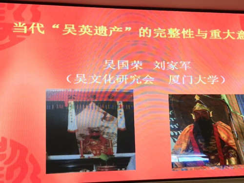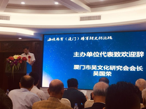 10月27日,由厦门市台办,厦门市社科联,厦门市政协文史学宣委指导的,由厦门市施琅研究会,厦门市吴文化研究会,厦门市临濮文化研究会主办的,由世界临濮施氏宗亲总会(中国台湾),厦门市姓氏源流研究会协办的《海峡两岸(厦门)将军祠文化论坛》,厦门宾馆富园厅开幕。吴国荣会长作为主办方参加了开幕式和论坛大会。