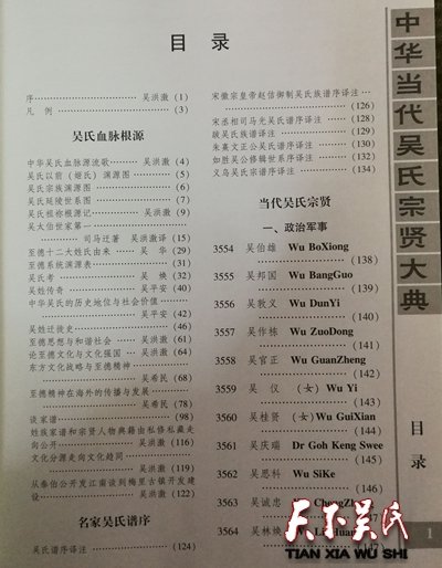 《大典》系吴氏家族史籍。收录范围不受旧的传统观念束缚,既收录吴氏中省军级以上高官名将,又收录造福一方的地方科局级及相当此级职称(均含副职)以上的中层人士;既收录吴氏中名闻遐迩的教授、专家、学者、高级文化科研人员和国营与民营企业家,又收录对国家、社会有一定贡献的族彦乡贤,同为一个目的:彰表贤士,激励后人。