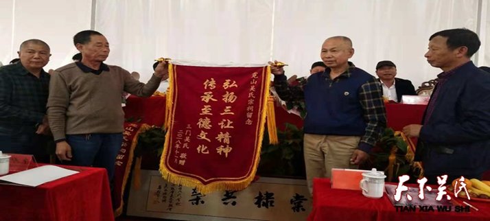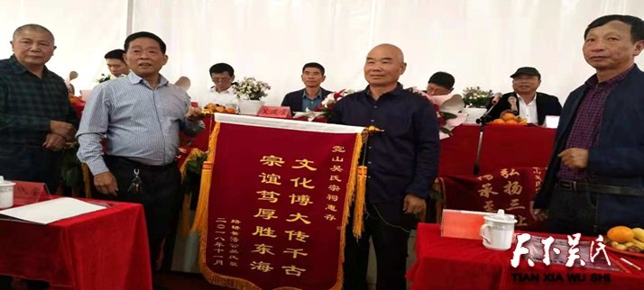 吴继初会长介绍了宗祠的发展及文化的历史渊源,讲述了伟大的历史人物和祠堂的悠久历史,想通过这种方式来教育下一代把这些优良传统代代传承下去,发扬光大。吴道富会长与吴肿照部长一起向霓山宗祠代表吴度云和吴庆文授牌,一块金光闪闪的吴文化传统教育基地的牌匾从此就要在这里生根发芽,它象征着中华传统文化,时刻警醒我们怎样弘扬正能量,如何教育下一代沿着祖辈的文化足迹,把传统文化撒向神州大地。吴金松会长就吴文化的发展历程,作了精彩绝伦的演讲,会场不时传来雷鸣般的掌声。