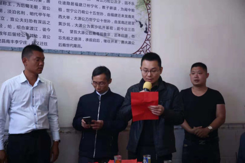 在庆典仪式上,上犹吴氏宗亲联谊会会长才河宗长、龙南吴氏宗亲联谊会日房宗长、紫阳长岭宗亲代表盛高宗长、营前片宗亲代表明华宗长、亲戚代表王敏先生、大源公优秀裔孙代表书才等宗亲先后发表了热情洋溢的讲话。庆典会上,吴才河会长还代表厦吴会副会长、第四届泰伯论坛秘书长吴先辉宗长宣读了他给庆典活动发来《大贤昔日开瑞景 源胤今朝著辉煌》的书面讲话。他们分别深情地给该宗祠宗亲寄予了殷切的期望和良好的祝福,赢得了大家一阵又一阵的热烈掌声。
