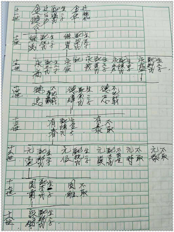 (76)保金—(77)克俭—(78)如励—(79)余—(80)禄—(81)时可(锡予)—(82)莆(敏吾)—(83)静淡—(84)日就—(85)朝魁—(86)荐