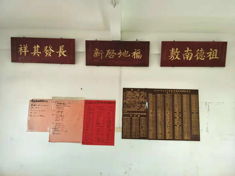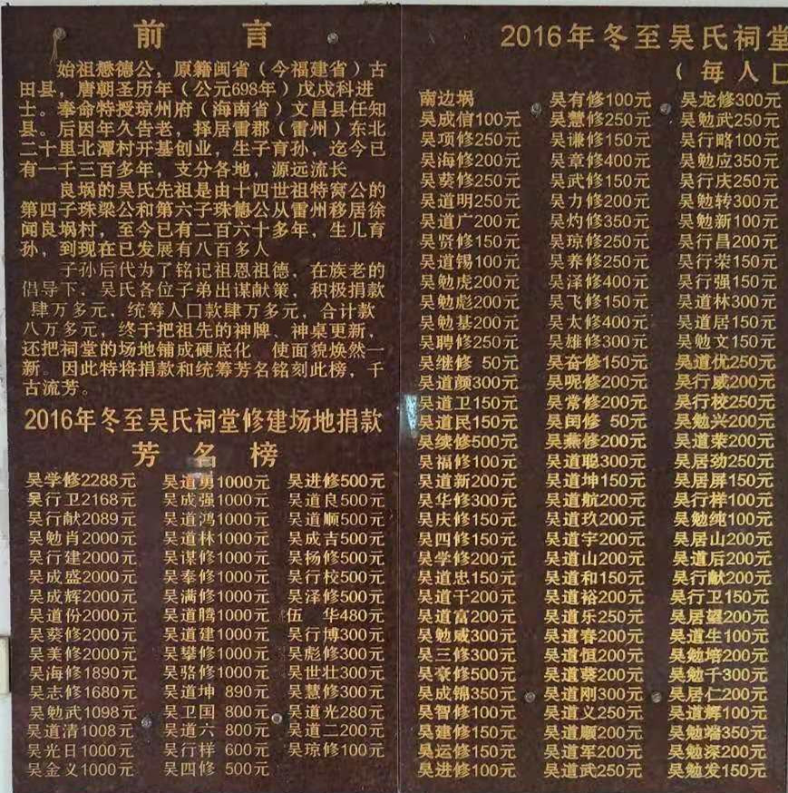 中午十二点半,代表团返回南山镇良埚,在吴氏祠堂,大家一起翻阅良埚吴氏族谱,据该支谱记,该支始祖为吴懋德,原籍福建莆田,唐代圣历年(698年)戊戌科进士,奉命特受琼州府(海南省)文昌县任知县,退休后责居雷州北潭村,开基创业,懋德公14世特窝公第四子珠梁、六子珠僡移居徐闻县良埚开基。目前该支在徐闻子孙约1000人左右。