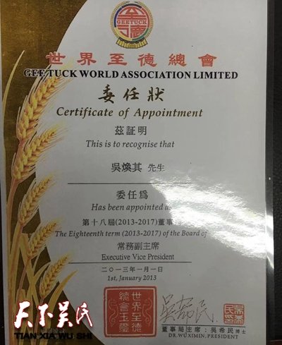 无锡顺心保洁董事长吴焕其赞助天下吴氏网壹万元