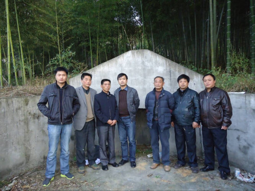 下午,吴立仁、利贤兄弟安排专车带我们前往他们的先祖墓地。中途,立仁的父亲吴建民宗长在路边等候,亲切握手介绍之后,一同前往晏家屋吴氏祖茔拜谒。在一处名为“天鹅孵蛋”的青山脚下,绿竹掩映处,悄然安卧着一座古墓。大家急切地走上前去,只见石碑上赫然刻着“祖妣吴母王氏老夫人及显考吴公宣福老大人合墓”这正是罗湾祥庶公之妻王氏及子宣福的安息之所,特别让人惊喜的是上面还刻有:“老籍太湖东乡吴家樟树”,吴家樟树正是罗湾的旧称,此碑立有近百年,宁国先祖真是不忘故乡,煞费苦心,告诉宁国子孙勿忘祖地罗湾。