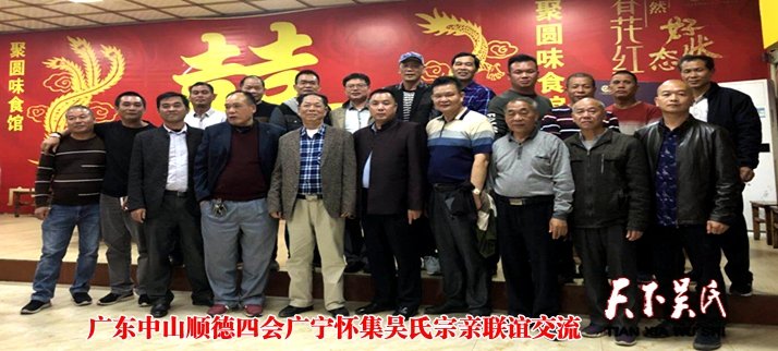 天下吴氏网讯(特约采编 吴昌禄)11月24日,广东中山、顺德、四会、广宁、怀集五地20多位吴氏宗亲齐聚广东怀集聚圆味食馆交流联谊。