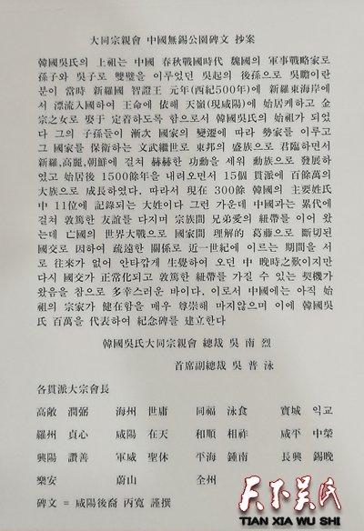 、吴贞心、吴在天、吴相祚、吴中荣、吴赞善、吴圣休、吴钟南、吴锡晚等吴氏宗亲专程前往中国江苏无锡吴氏祖地泰伯陵树归宗碑,碑文上落款的名字有总裁吴南烈、首席副总裁吴谱泳,各贯派大宗会长:吴润弼(高敞)、吴世庸(海州)吴泳食(同福)、吴
