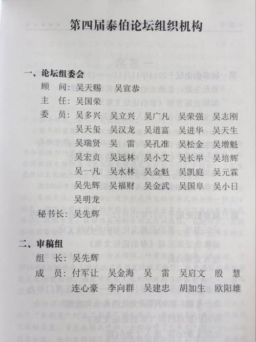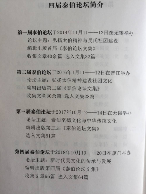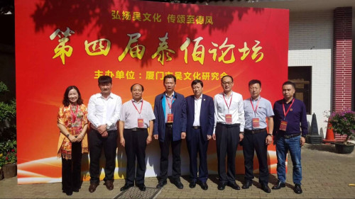 2018年10月20日,由厦门市吴文化研究会主办的第四届“泰伯论坛”在厦门宾馆明宵厅举行。本届论坛邀请了来自全国各地吴氏重要嘉宾:国务院原副总理吴桂贤、国台办原副主任、厦门大学教授张铭清。中国书院协会会长、湖南省社科联副主席、湖南大学岳麓书院原院长朱汉民、世吴二届主席吴良民、海南省机械局原副局长吴多兴宗长、北京大学文化研究中心主任龚鹏程、无锡祖籍地总会会长吴立兴、江西鹰潭宣传部副部长吴超来、赣州南康政协副主席吴明能、新加坡国立大学教授杨松年、厦门大学教授连心豪、徐学、刘家军、厦门市姓氏源流研究会会长陈淑娥、潮汕总会名誉会长吴朝瑞、会长吴汉龙、执行会长吴宏贞、南阳会长吴雷、东莞创会会长吴年伯、名誉会长吴铭煜、湖北创会会长吴志刚、会长吴合林、湖南会长吴增魁、贵州会长吴进华、黑龙江会长吴天生、安徽执行院长吴瑞贤、浙江执行会长吴松金、温州江南会长吴作榜、香港总会副主席吴荣宗、福建省总会常务副会长吴本坤、台北吴耀旭、福建海峡总会会长吴剑峰、金门总干事吴联福、大连创会会长吴培领、会长吴长举、赣州会长吴强、漳州市吴文化研究会会长吴兆华、华夏吴氏网站长吴卫东等。