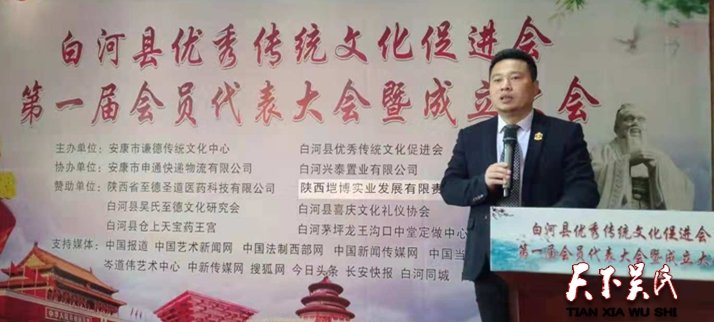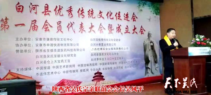 陕西省吴氏宗亲联谊会会长吴风平在致辞中对白河县优秀文化促进会成立表示热烈祝贺!吴风平说,万树寒无色,南枝独有花;春色满园关不住,一枝红杏出墙来。虽然窗外寒风刺骨,室内却是热情洋溢,今天我们相聚在天池大酒店,共同庆贺白河县优秀传统文化促进会成立大会,此时此刻,相信大家和我一样,心情激动,热血沸腾。这不仅仅是因为促进会的成立,而是开创了我们安康市乃至陕西省的先河!是前无古人后无来者,也是践行和落实党中央弘扬传统文化精神的实际行动。