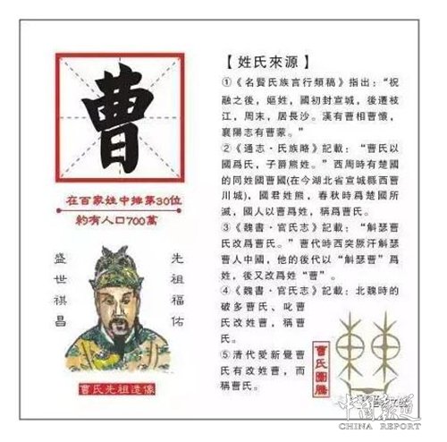 宗族特征:曹姓名人辈出,从官员将帅到文人墨客,从三国曹操到清代曹雪芹,均在曹姓的发展史中留下了浓重的一笔,为后人所崇敬。