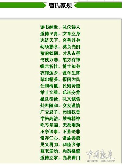 曹姓宗卷 曹姓的字行辈份除排列有序井然外,还体现着报国忠贞,勤俭治学的家规家训。如曹振甲所修《曹氏家谱》中江苏曹姓一支字行为:“春贤泽绶衡,善禄道耀勋。”湖南省南岳衡山曹启宗后人字辈:第四至十九代字辈:承廷光文,德仲仕子,仁世大通,淑贤元子。第二十八代起字辈:懋学徵绍虔,家良致述先,希时华邦庆,景登允尚传,积善贻芳远,培基树泽长,业修斯富有,本立定荣昌。湖南省郴州市宜章县赤石乡上塘背字辈:朝万叟知 受孟惟思 钧尚大仕 仁子任嗣 文经兼武纬翊 祖德源 诗书钊勤 家富益廉 真杰义善 登高超新。湖南芷江曹氏字辈:“之子言文与齐思庭世昭光继恕承先代法可得久长安邦定治平福享久成荣正大鸿运兴万家庆天恩”。湖南常宁曹氏字辈:“子应荣达 继必贤良 诗兴泽后 孝启家祥 芳连甲第 声振朝堂 光余先祖 百世其昌”。1994年新续字辈:“仰承洪范怡和泰康敦崇礼义德业昭章福禄绵远晖耀平阳”。湖南芷江曹氏字辈:“文大致启宗国学万世兴家传日新胜吉庆中长应”。湖南凤凰曹氏字辈:“长延祖宗宏绪达启世代仁义忠厚贤良俊秀尚德景星庆云”。民国三十二年曹时药《六修曹氏支谱》,湖南益阳曹姓一支字行为:玉受秀贤彦,必钦子冠锡,良文教尔廷,家盛英嗣起,时安德泽芳,显承师俊业,圣哲立名郅,仁孝怀三代。