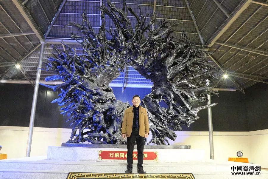 台商卢泓杰与成都乌木艺术博物馆镇馆之宝“万根同心太阳神”。