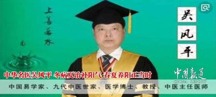 吴风平,男,医学博士、教授、主任医师、执业医师、高级针灸师、高级中药技师。九代中医世家,幼承庭训,六岁学医,十三岁临床,师承国家中医前辈吕炳奎、朱良春、周仲瑛、关幼波。先后出版了《吴氏秘验方精选》;《吴氏九世中医秘验方精选》等9部个人医学专著,获得国家发明专利十几项。