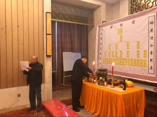 宜兴南岳山庄宾馆会议厅内正中悬挂“宜荆吴氏济美堂宗亲祭祖会”横幅。右侧正中悬挂宜兴拜祖图:一世祖德明公夫妇等祖先神位:两边竖写桃花流水杳然去、留得和风惠子孙;供品琳琅满目;气氛庄重热烈;神情肃穆神圣;香火氤氲,宗亲们按序焚香祭拜、敬献花果珍馐。吴氏族人怀着崇敬之情向祖先上香、跪拜先祖,保佑家家户户人人身体健康。出入平安!人财两旺!福泽绵长!