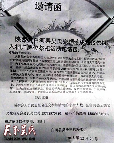 陕西省吴氏宗亲联谊会白河县分会,白河县至德吴文化研究会,2018年年终总结会暨按传统风俗道士做法迎接人类始祖,吴氏历代先祖(包括已故的父母爷奶);更欢迎其他宗亲提供自己近代祖先的名号,入祠供奉。入祠堂归牌位祭祀大典(堂祭),这是家族几十年难遇的荣幸喜事。吴氏先祖终于有了栖息之地供后人缅怀纪念,竹白吴氏宗亲按户无故不得缺席,出嫁姑娘也应积极参加,给先祖叩头上香烧纸,保佑所有宗亲,万代兴隆。心想事成,幸福安康。更欢迎各支系宗亲各姓氏知名人士光临指导。
