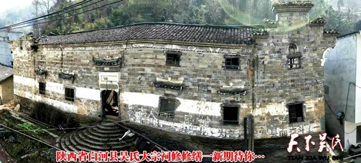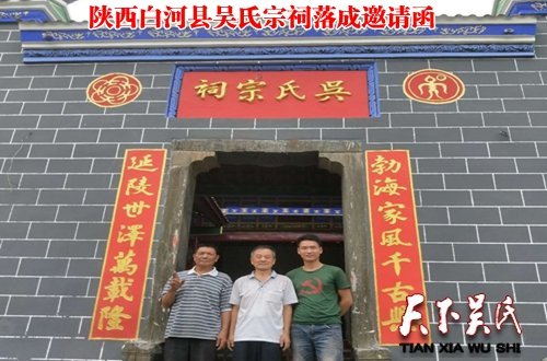 承蒙各地宗亲当地知名人士及竹白吴氏宗亲的鼎力支持,修建陕西省白河吴氏大宗祠历经两年修建已基本完工此功德无量将刻碑留芳。正所谓天下吴氏一家亲,为了弘扬家族文化促进宗亲和谐交流,增强宗亲的团结互助,共同庆祝我族这一盛事,经宗亲领导商议择吉日于公元2019年元月30号(农历腊月25日)星期三上午10点在祠堂隆重举行。