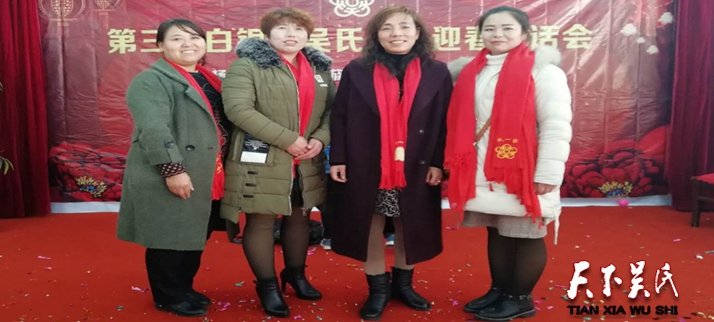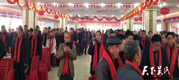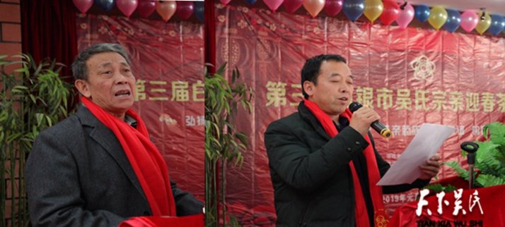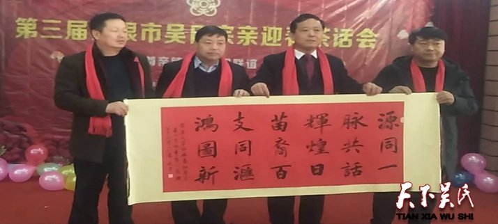 2019年1月6日这一天是农历戊戌年腊月初一,位于西北黄土高原黄河之边,具有悠久历史的甘肃靖远县城,寒风凛冽,阳光明媚。第三届白银市吴氏宗亲迎春茶话会在靖远县城乌兰宾馆隆重举行。大会会场绚丽多彩,喜庆祥和,与会宗亲精神饱满、情意浓浓。会议由靖远宗亲吴承祖、吴玉淑联合主持。上午9时30分,主持人以激情昂扬的开首语正式拉开会议序幕,并在庄重的《国歌》声和悠扬的《吴氏颂歌》中隆重开幕。首先,为表达对历代吴氏先祖的敬仰之情,与会宗亲向历代吴氏先祖行默念礼!随后,本次会议筹备工作组副组长、承办会议宗亲代表吴华致欢迎辞。会上,白银市吴氏文化研究会(筹)会长,本次会议筹备工作组组长吴有忠做主题讲话;白银市吴氏文化研究会(筹)副会长、景泰县吴氏宗亲会会长吴守存,甘肃条城吴氏家族宗亲会副会长吴文贵和会议赞助单位甘肃滨河酒业销售有限公司经理陈涛分别向大会致辞。为达到宗亲交流,共话吴氏事业,会上参会各地宗亲代表吴守春、吴玉君、吴正态、吴国新、吴秀娟、吴曜辰、吴映璋等宗亲围绕弘扬传承吴氏文化、开展宗谊交流、回顾家族历史、弘扬祖德、践行孝道等问题进行交流发言,大家谈认识、谈体会、共话吴氏未来发展大计。大家一致认为,组织开展白银市吴氏宗亲联谊活动,大力弘扬和践行以吴氏文化为主要内容的优秀传统文化,是振兴吴氏文化发展、推动社会文明进步的现实需要,是适应新时代社会发展潮流的需要。一致表示,要以“不以物喜,不以己悲”和“勿以小善而不为,勿以无利而不做”的思想境界,积极参与宗亲活动,加强对吴氏历史文化的学习和研究,增强践行优良传统主动意识。大家倡导与会宗亲要始终以胸怀感恩的向善心态,关心吴氏事业,注重良好家风传统的营造,积极参与和支持白银市吴氏文化研究会工作,共同为弘扬吴氏文化、传承至德精神尽心出力,做出自己的贡献。